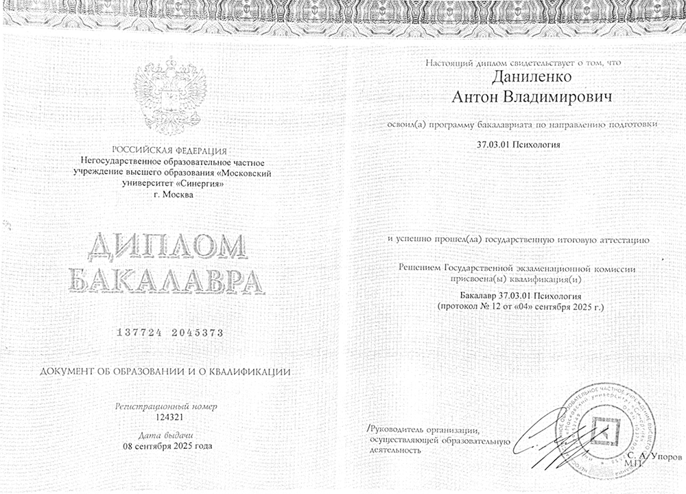 • Московский университет «Синергия», психология, 2021–2025 гг.